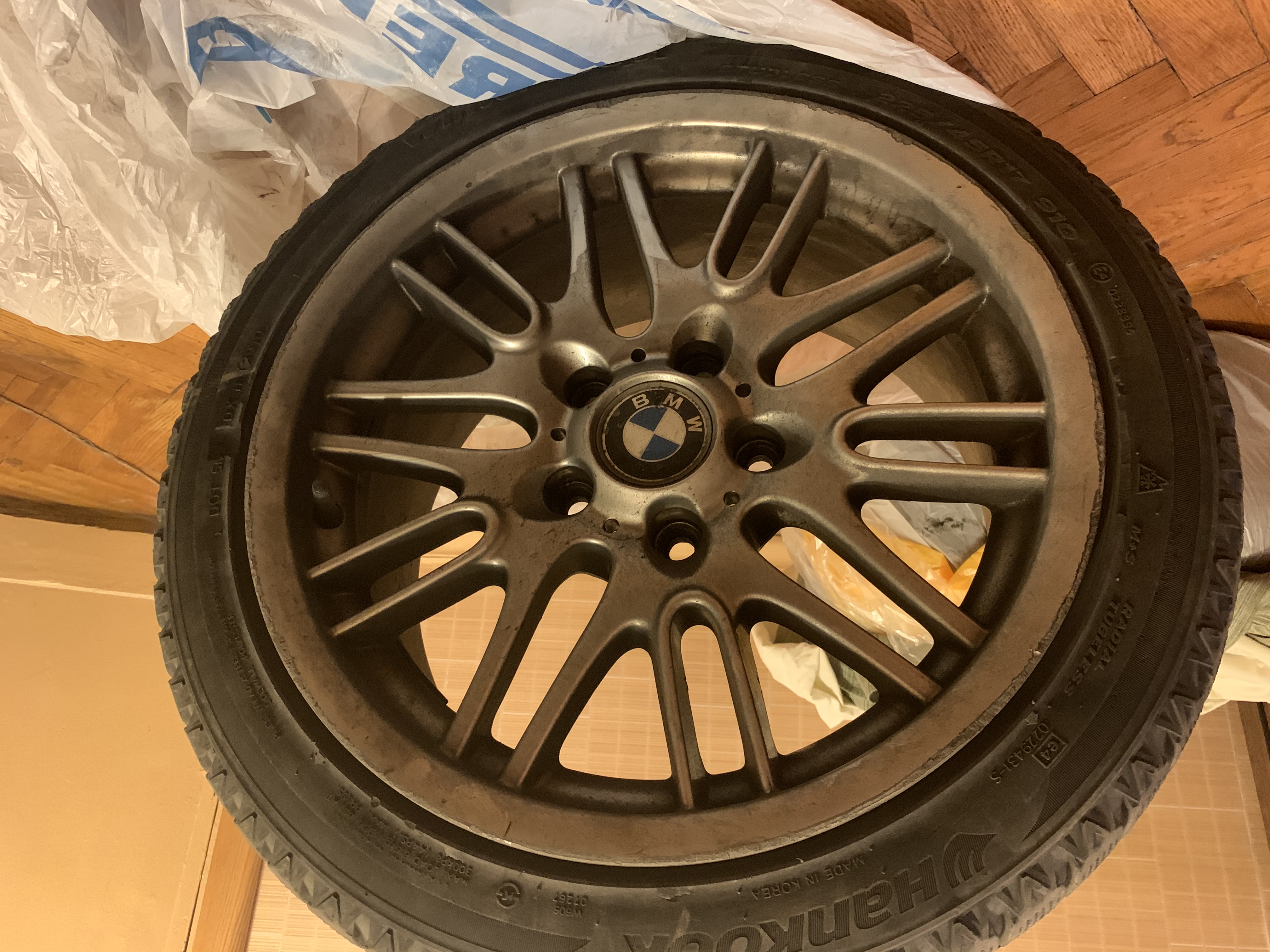 Колеса в сборе с зимней резиной hankook. Остаток около 5 мм, без грыж и прочих дефектов. Колеса реплика, в хорошем состоянии, есть бордюра 23000р
