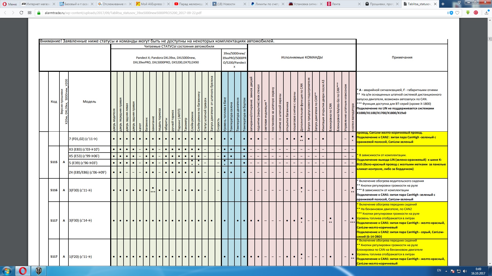 deadmaus5 : Подключили pandora dx90l по кан. Из функций, по кан не работает только открытие багажника, ну и не видит открытый капот, так как сверлить я отказался, а оригинального концнвика нет. У пандоры минус только в том, что брелок любит батарейки Открытый капот - не проблема. Ставишь концевик в шататное место - где был бы концевик от штатной сигналки. Открытие багажника у меня работает, если машина "проснулась". Если спит на охране - всё обесточено. Вот и не работает. Всякие двери можно и по аналогу подключить через диодные развязки, и если сигналка видит низкоуровневые сигналы. Если не видит - то только плафоны... Щаз: BMW 320D > Swapped > 330D Touring Иногда: Nissan Terrano |